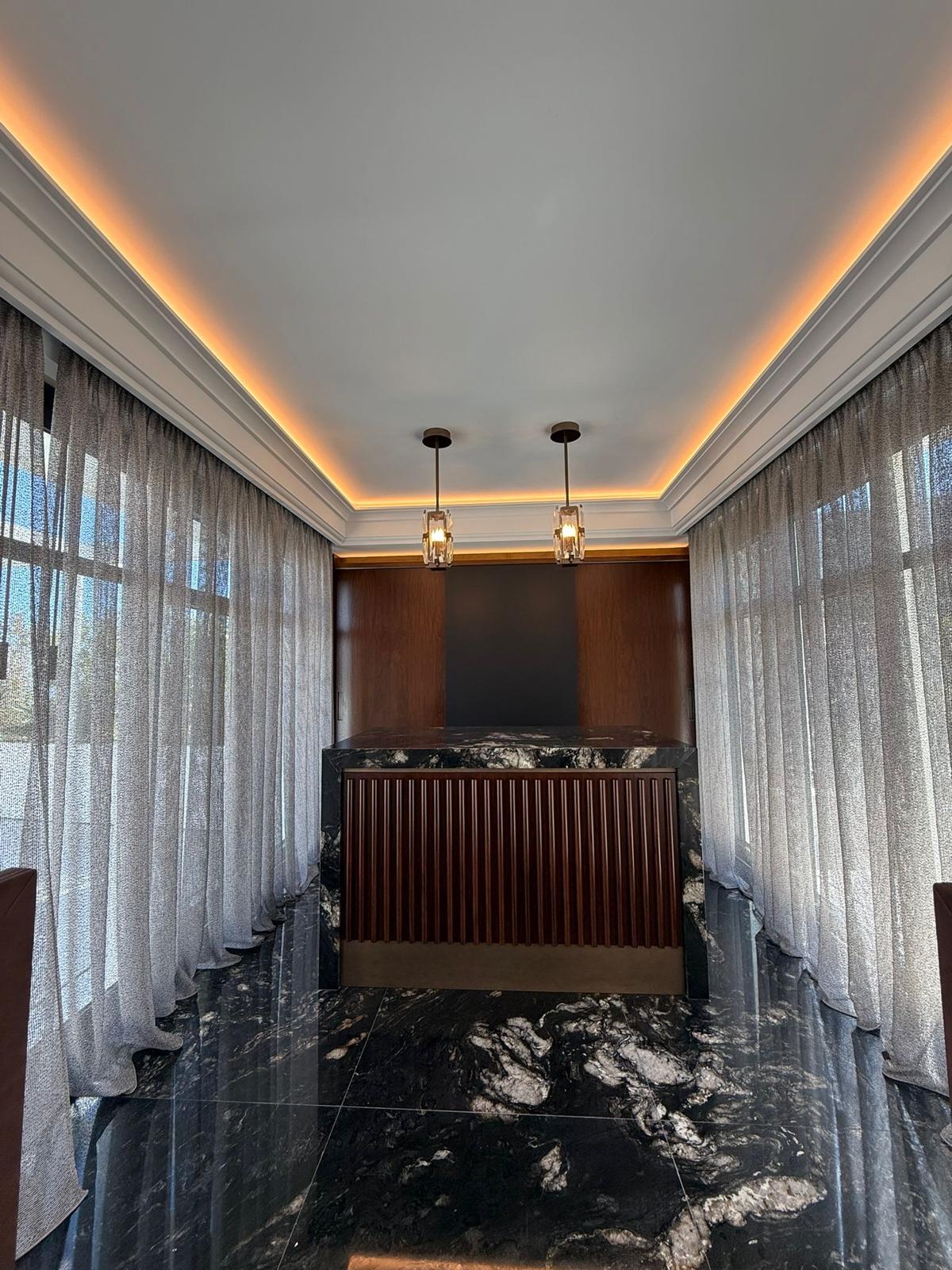 Il ajoute de la profondeur et de la mobilité à l’espace en donnant au plafond une structure en couches. Il est généralement préféré dans les halls et les halls d’entrée des hôtels.