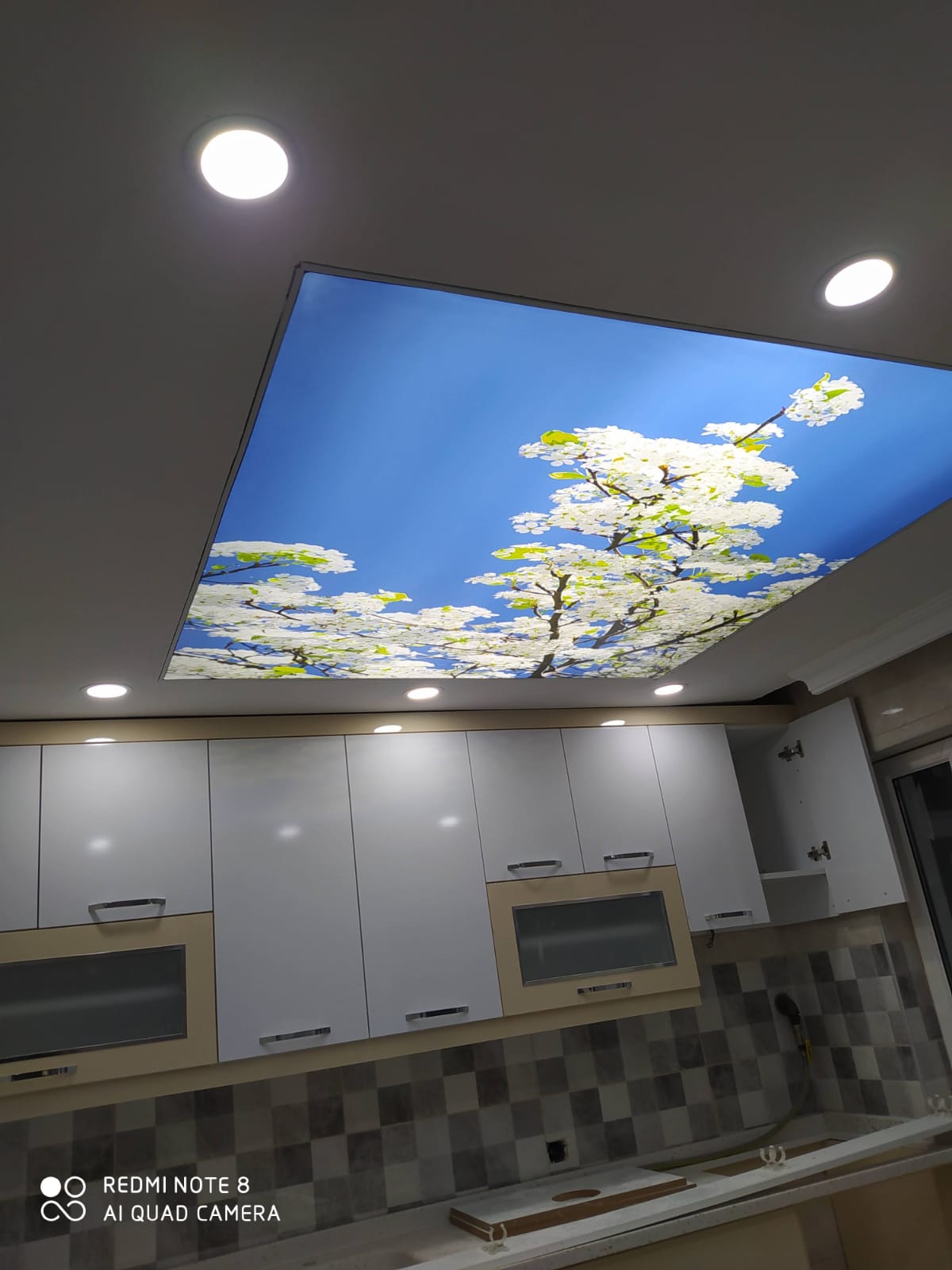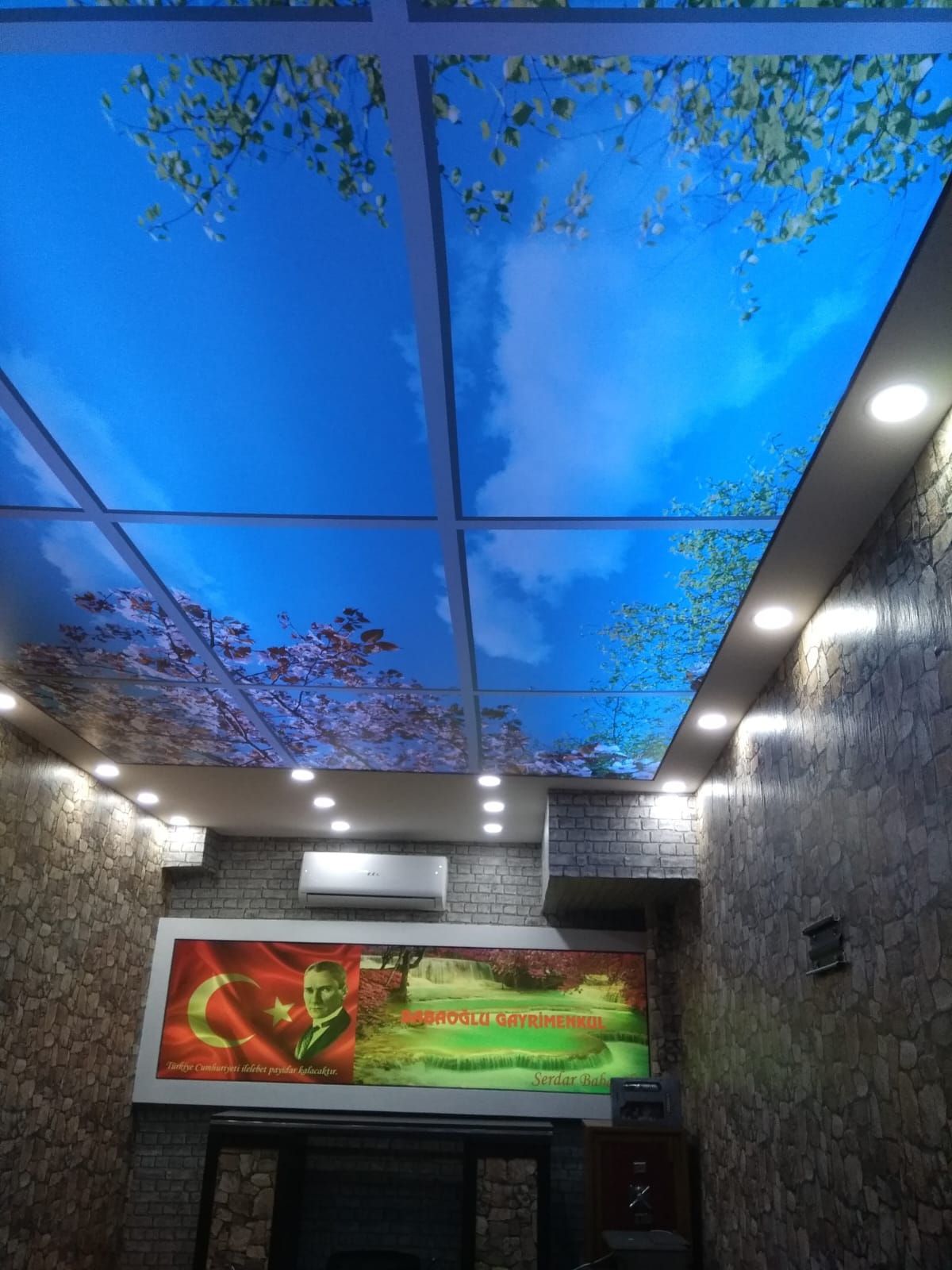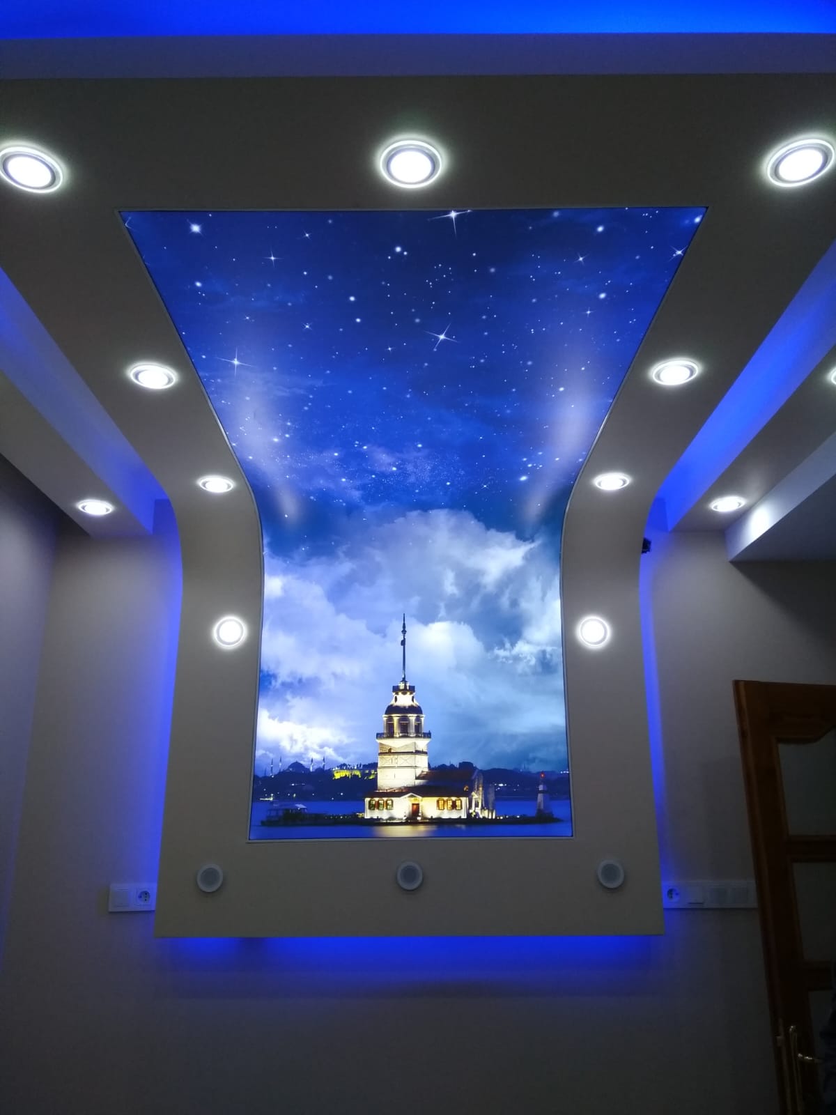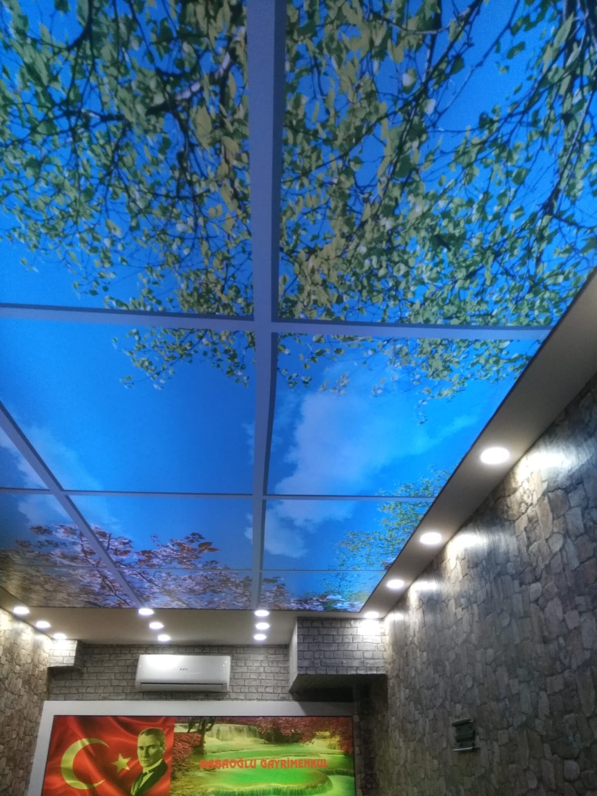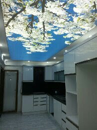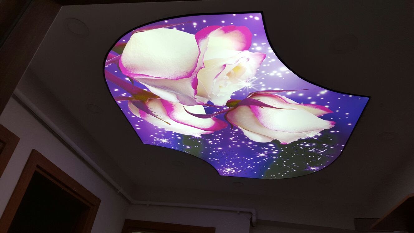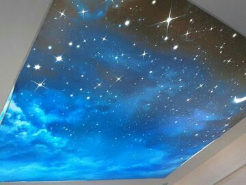 Plafond tendu à motifs et impression numérique : possibilité d’imprimer n’importe quelle image, logo ou paysage. Ce type de plafond est particulièrement apprécié pour les créations personnalisées et l’image de marque.